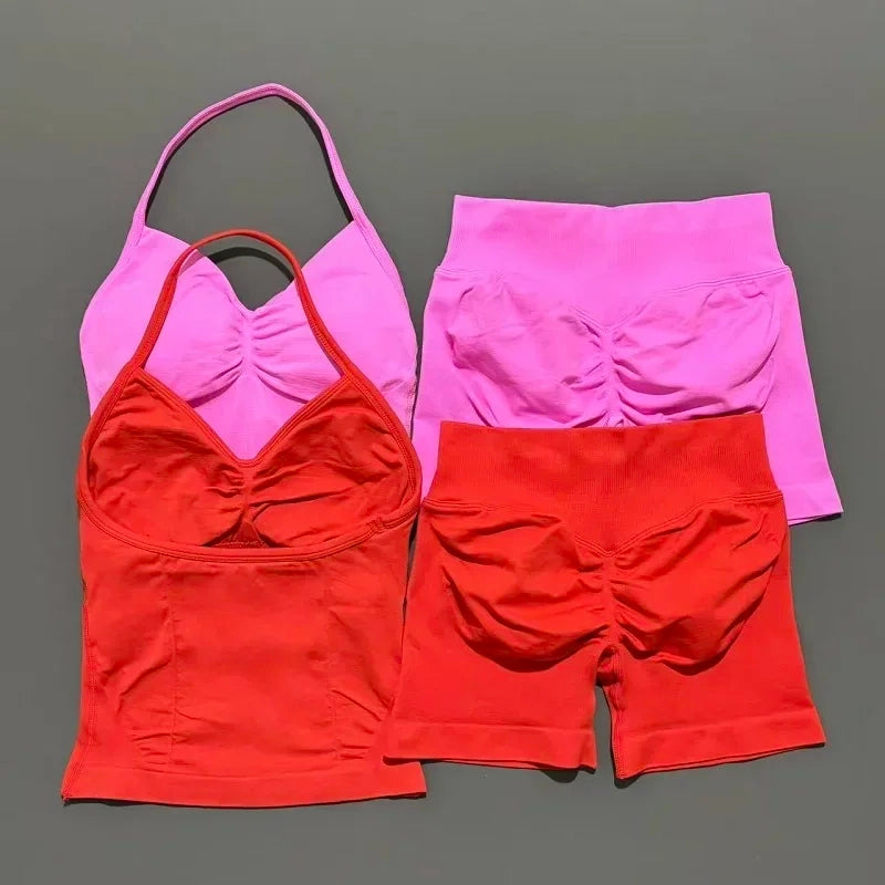 Turn heads with our backless halter tops and seamless shorts. Style meets sweat in every pose.