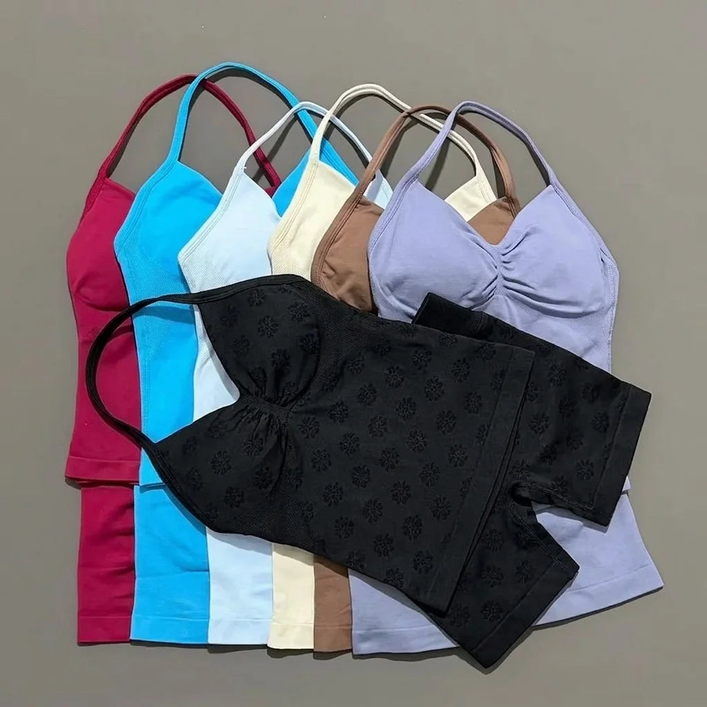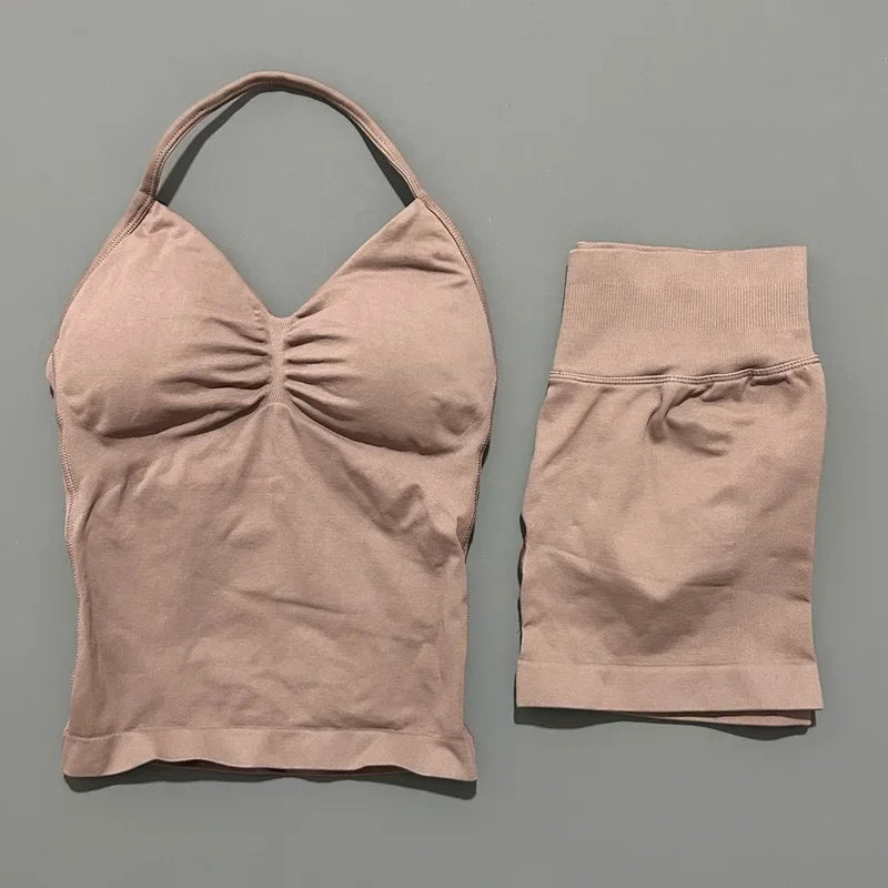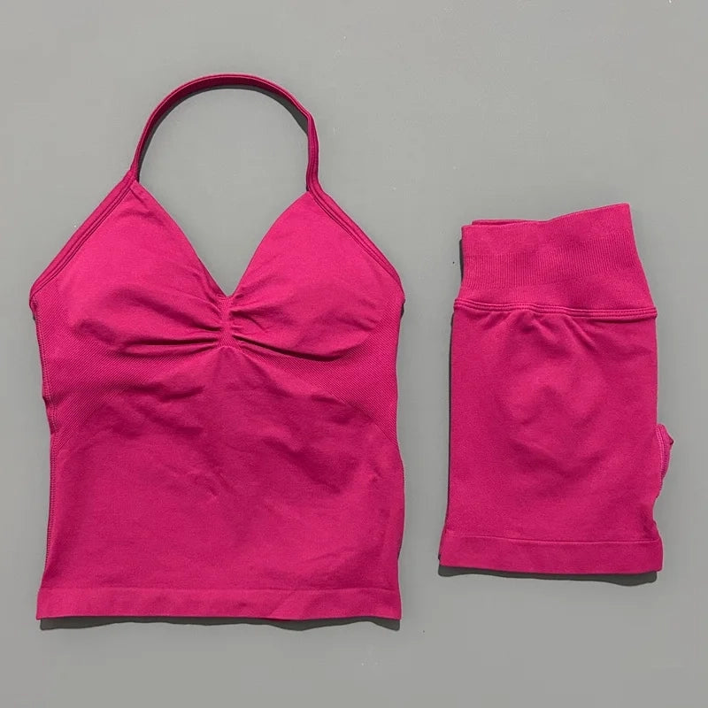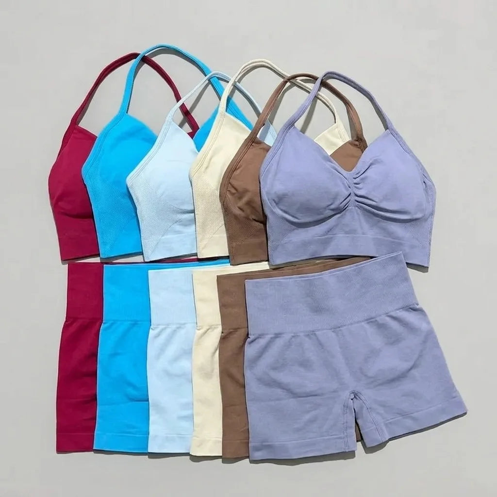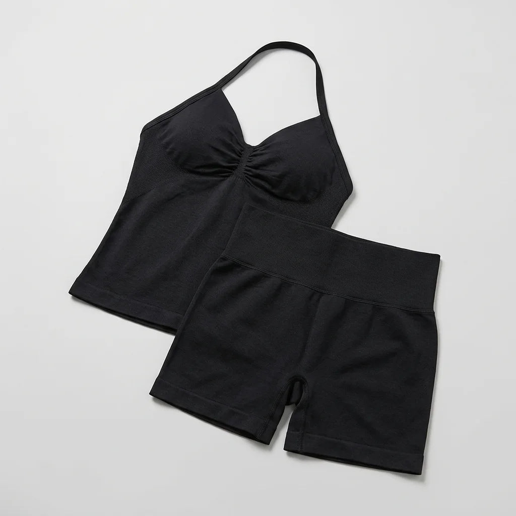 Turn heads with our backless halter tops and perfectly sculpted shorts. Designed to flatter, these sets blend high fashion with active performance.